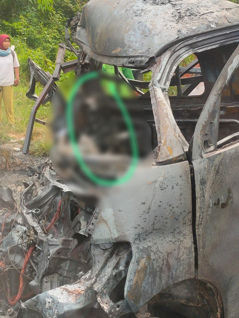 Mobil yang diduga usai melakukan antrian pelangsir BBM di wilayah kabupaten Damasraya, Naasnya Korban hangus terbakar bersama unit mobil Gran Max bernama Antoni (32) warga Dusun Sungai Mancur, kecamatan Tanah Sepenggal Lintas, kabupaten Bungo.
