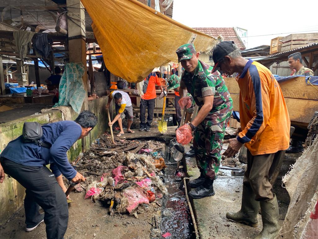 Kodim 0415/ Jambi bersama dengan unsur stakeholder terkait dan juga masyarakat melakukan karya bakti TNI di Pasar Keramat Tinggi Kecamatan Muara Bulian Kabupaten Batanghari pada Sabtu, (9/12/2023) pagi.