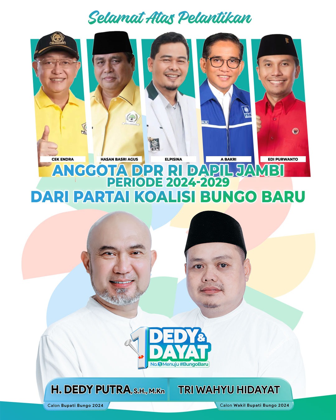 Dari 8 anggota DPR RI dapil Jambi tersebut, 5 diantaranya masuk ke dalam koalisi partai pengusung Calon Bupati dan Wakil Bupati Bungo nomor urut 1 yakni H Dedy Putra, SH,.M.Kn dan Ustadz Tri Wahyu Hidayat.