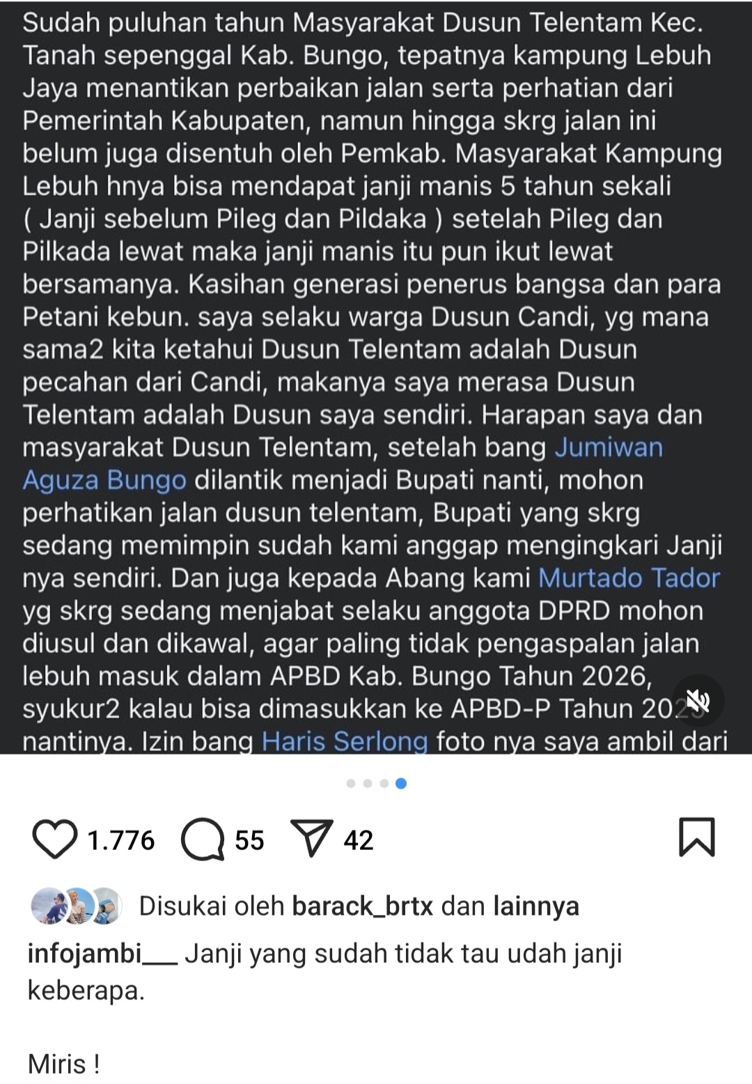 Bahkan Bupati Bungo diminta agar iba melihat kondisi jalan rusak yang tiap hari dilalui mereka.