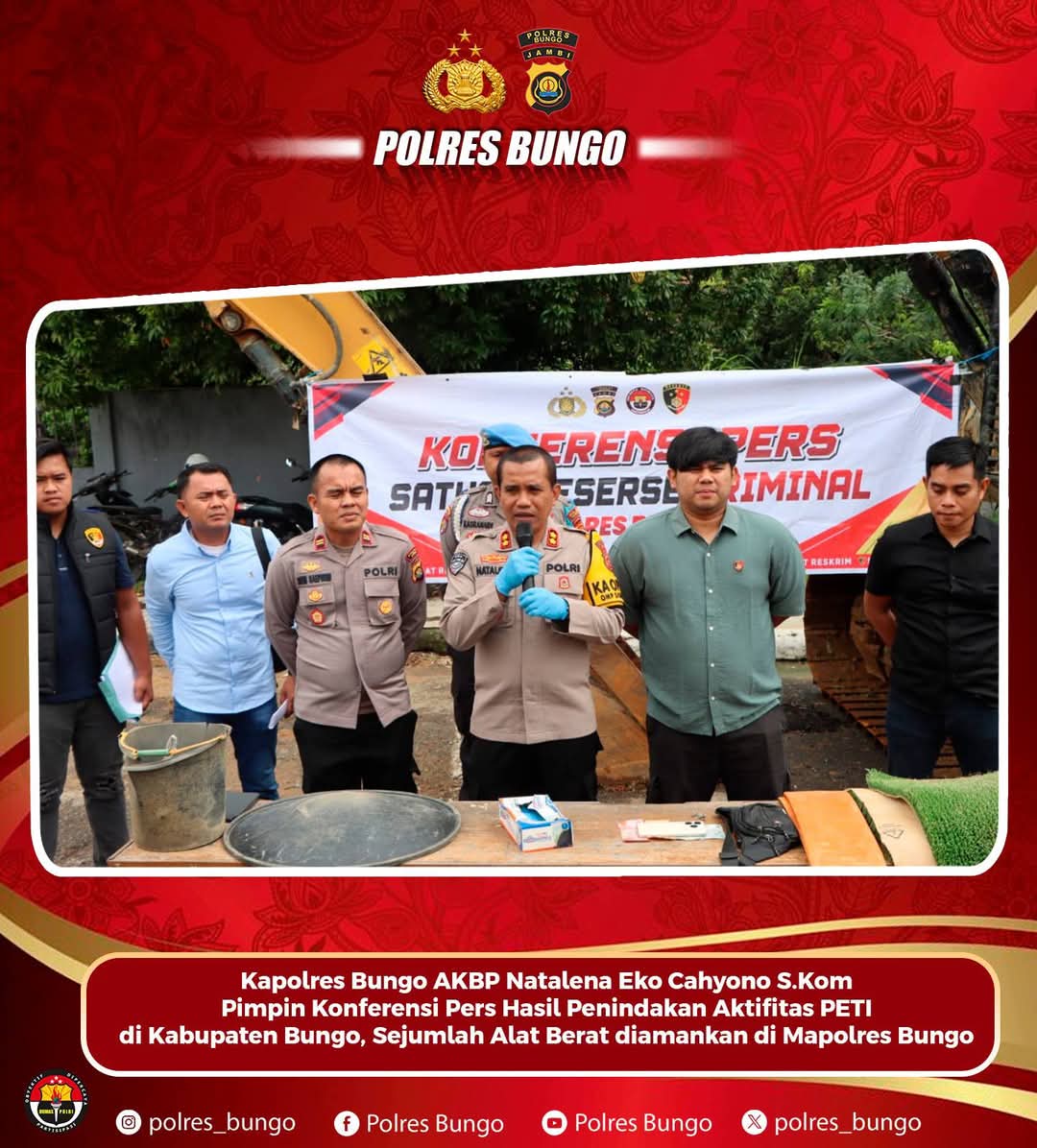 MUARA BUNGO-Polres Bungo menggelar Konferensi Pers terkait penindakan aktifitas Penambangan Emas Tanpa Izin (PETI) di Kampung Baru, Desa Sungai Telang tepatnya diseberang Jalan Muarabuat – Sungai Telang, Satu Kilometer dari Pulau Cinta, Kabupaten Bungo, Provinsi Jambi.