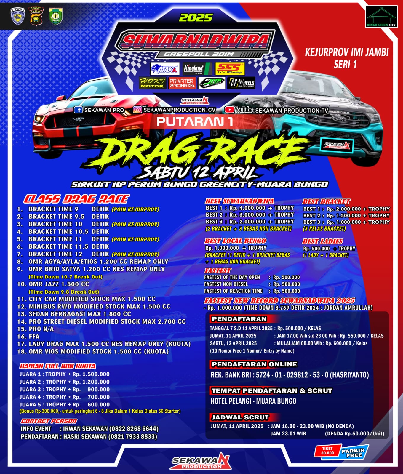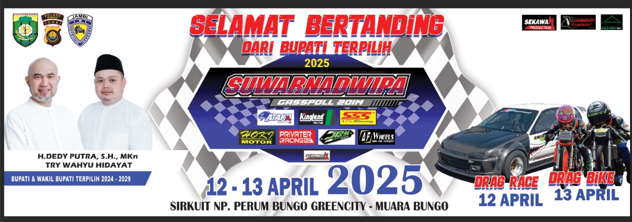 Sabtu dan Minggu, 12 & 13 April 2025 akan digelar Drag Race dan Drag Bike serta Motor Contest, di Area Perumahan Bungo Greencity Muara Bungo.